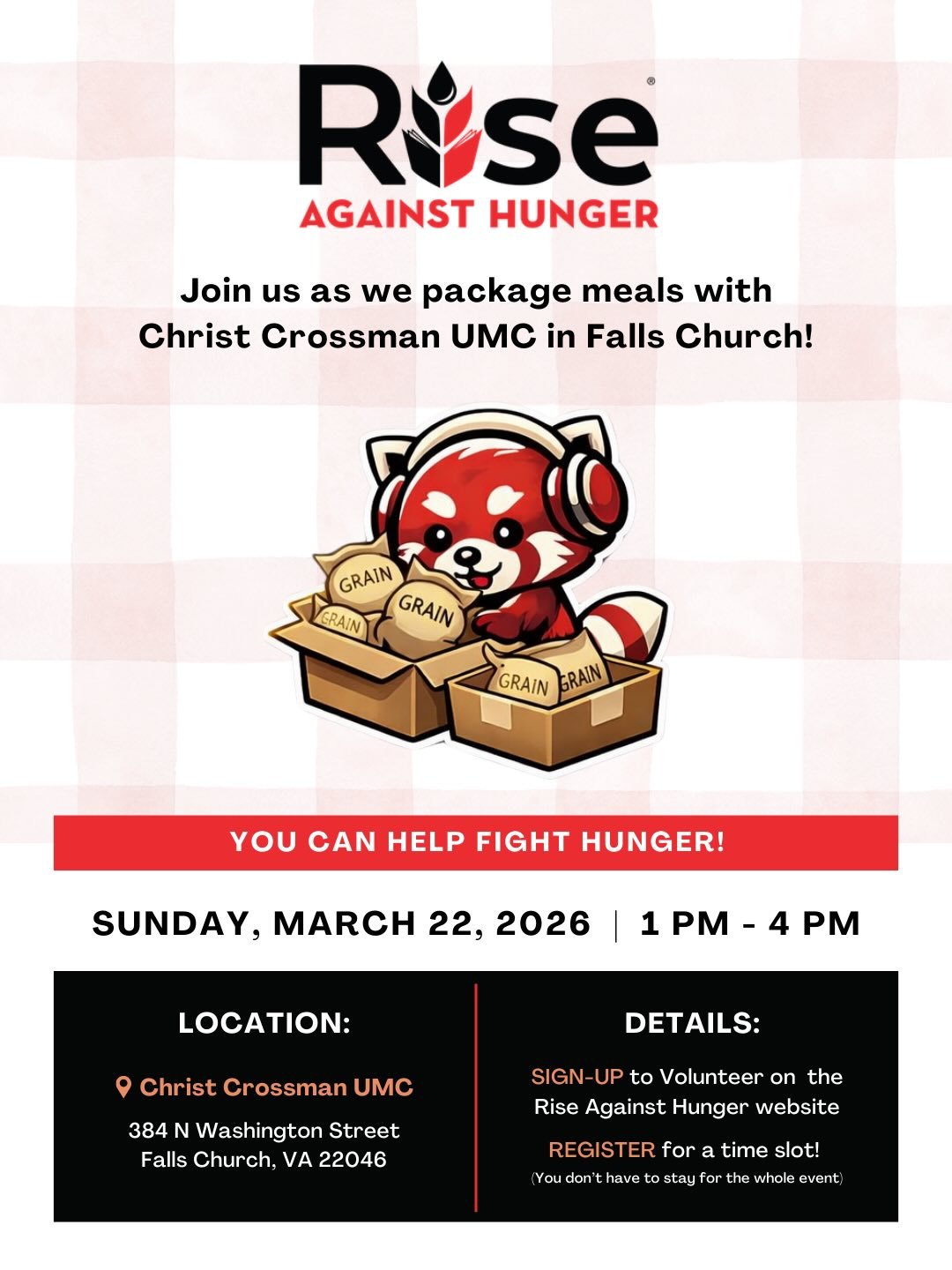 Rise Against Hunger Meal Packing EventMarch 22, 2026 | 1-4 pm | Christ Crossman Methodist Church